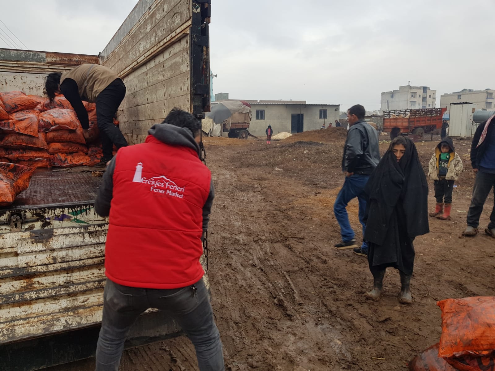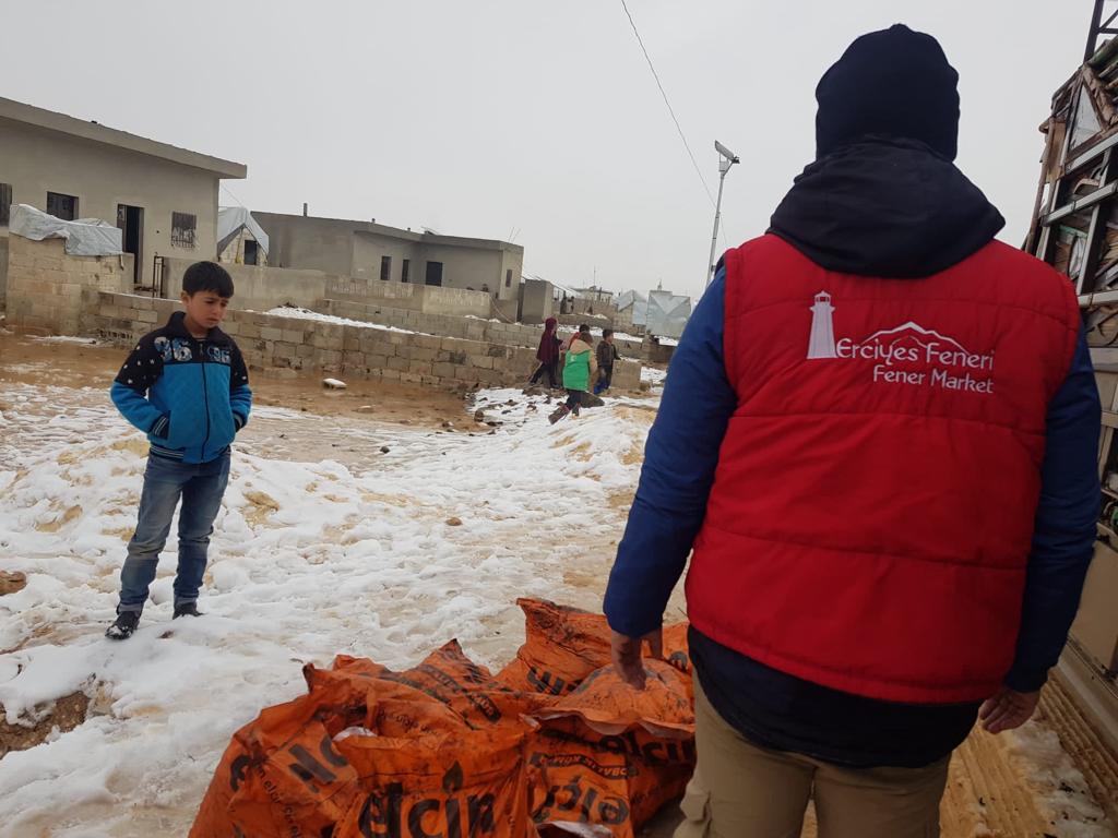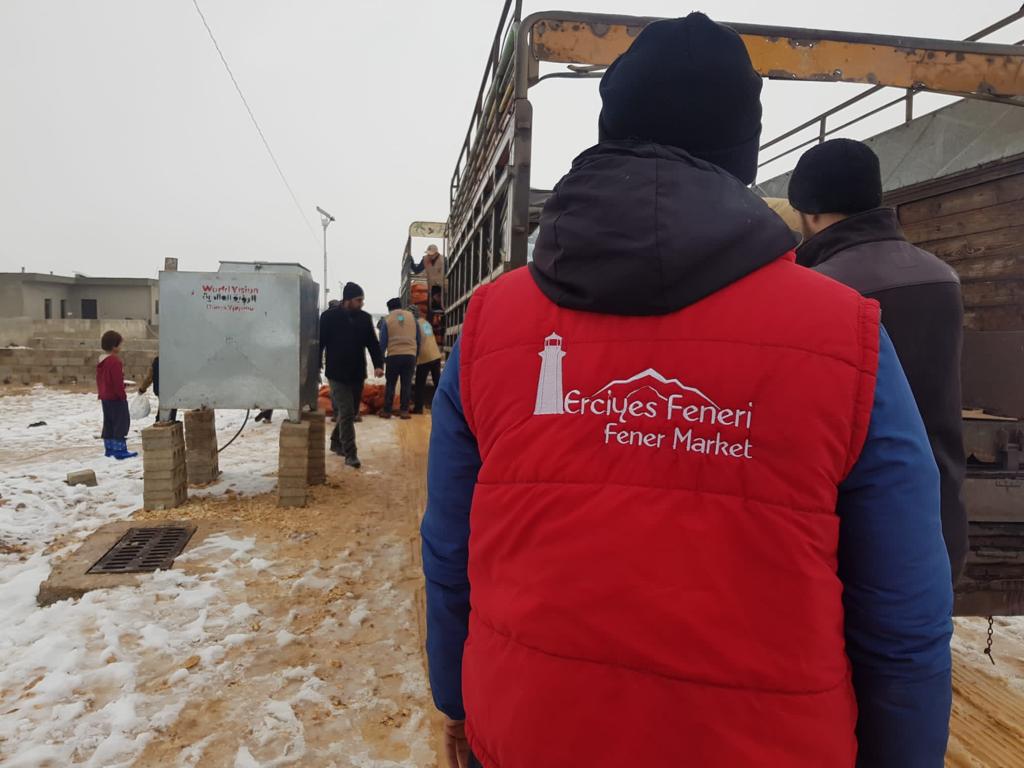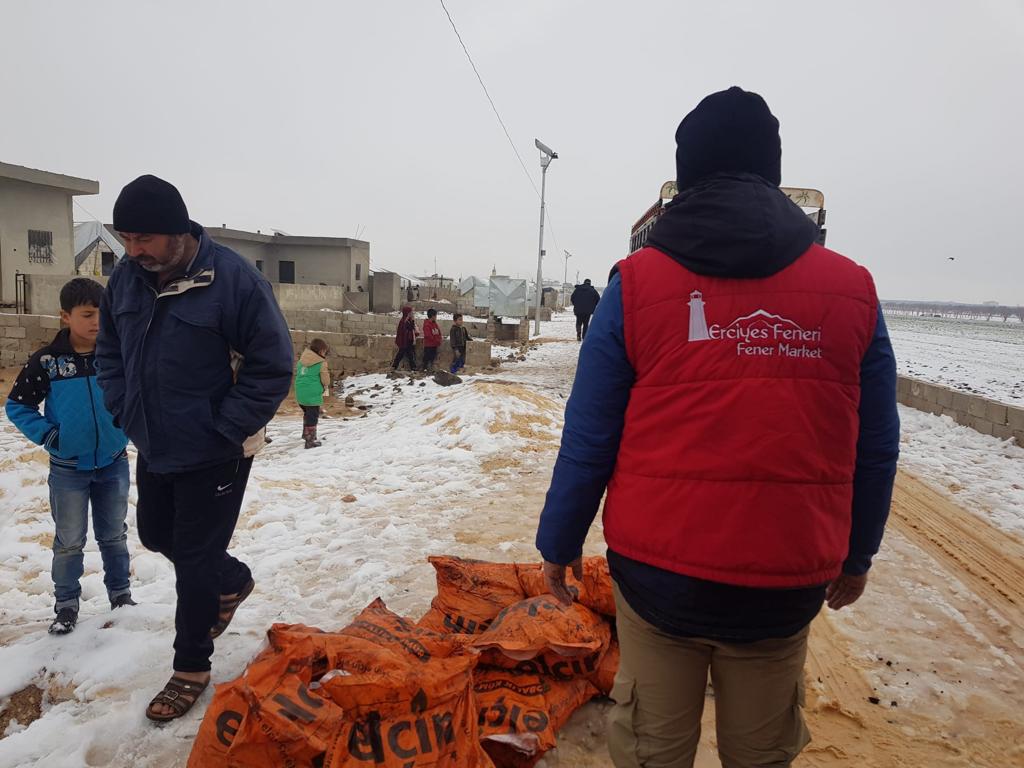 Erciyes Feneri Sosyal Yardımlaşma ve Dayanışma Derneği Suriye’nin İdlib, Azez, Afrin bölgelerinde yoğun kar yağışı altında çadır kamplarda hayat mücadelesi veren savaş mağdurlarına; Bu soğuk kış günlerinde 2 tır 3000 aileye için gıda paketi, 1 tır günlük 3000 kişiye yemek dağıtan aşevinin 3 aylık gıdası, 6 tır 150 ton kömür yardımı yapılmıştır. Bu kapsamda kömür, battaniye, branda, halı, hasır, sünger yatak, kışlık kıyafet, bot, gıda-hijyen paketleri, mutfak eşyaları ve nakdi yardımları sahadaki arkadaşlarımız yapmaya devam ediyor.