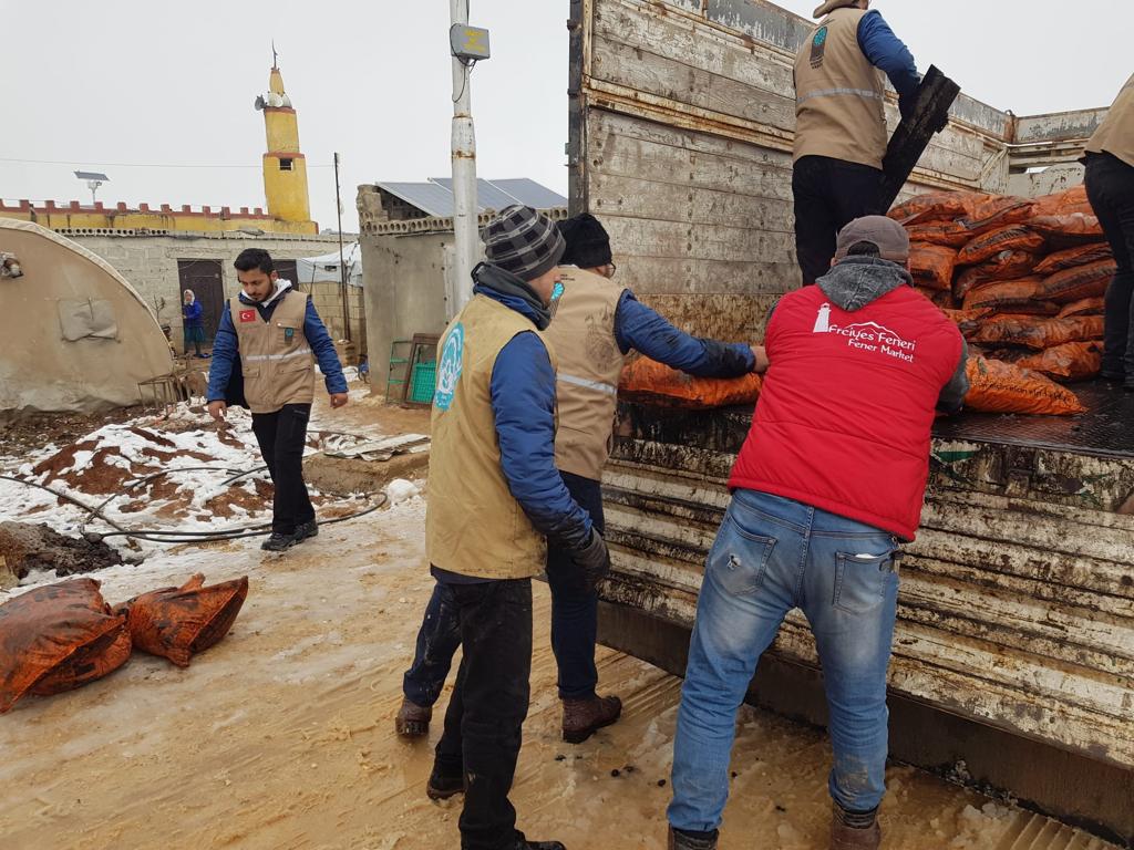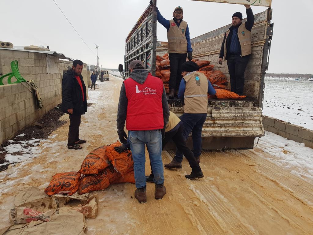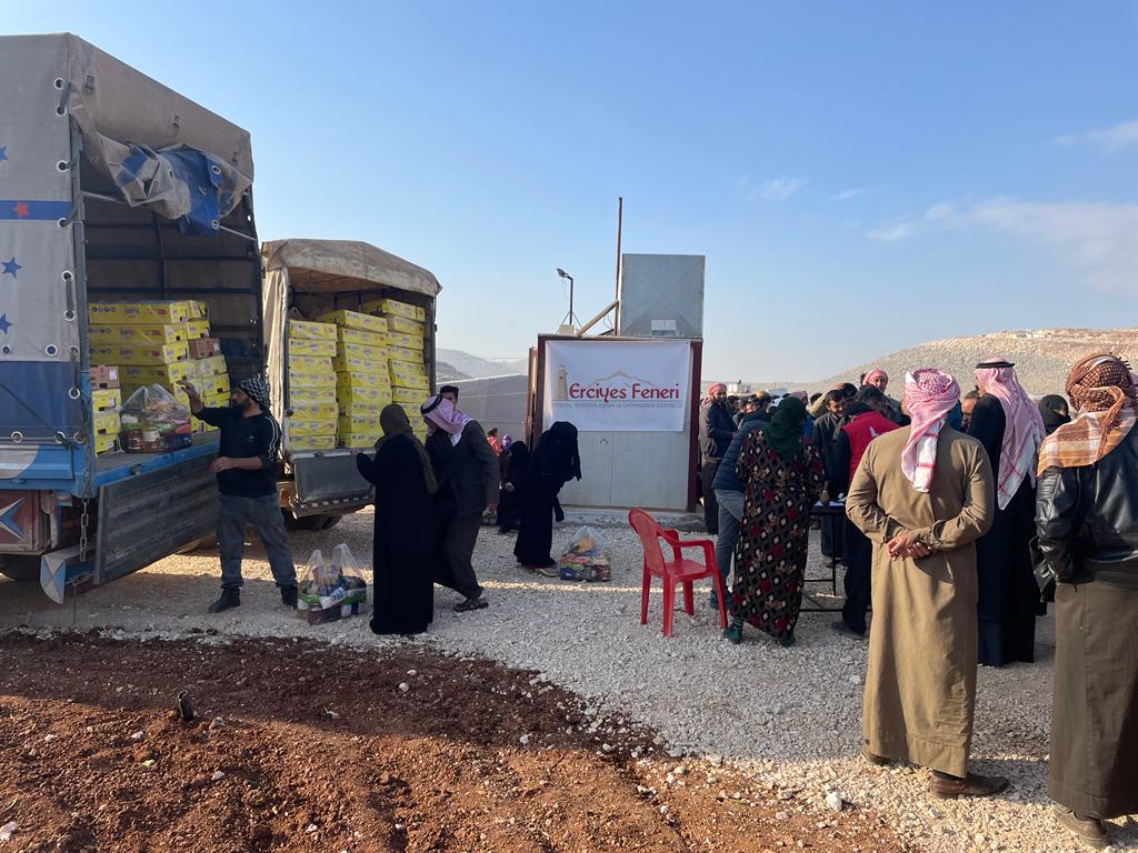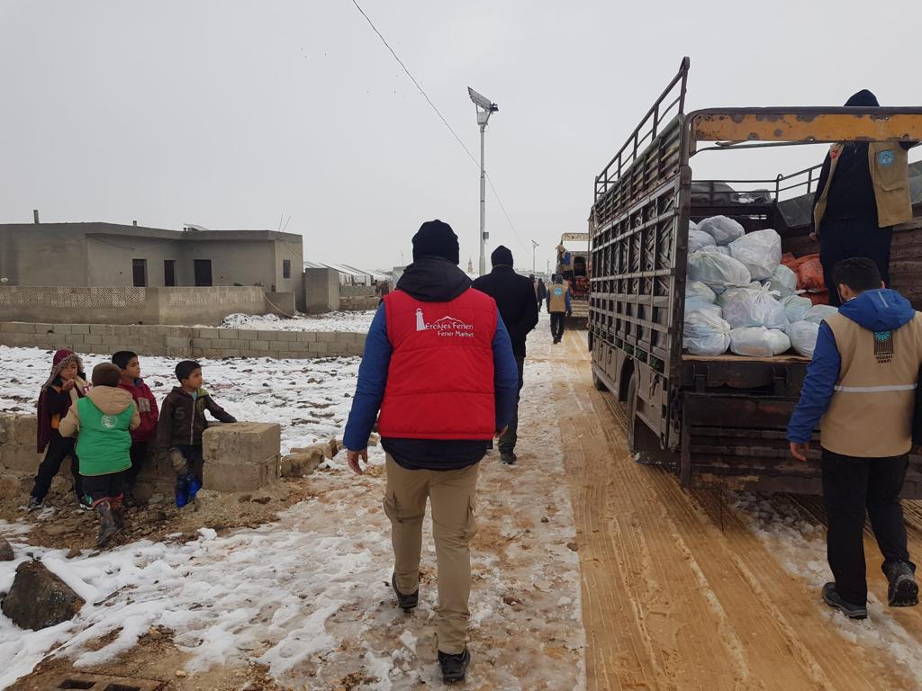 Erciyes Feneri Sosyal Yardımlaşma ve Dayanışma Derneği Suriye’nin İdlib, Azez, Afrin bölgelerinde yoğun kar yağışı altında çadır kamplarda hayat mücadelesi veren savaş mağdurlarına; Bu soğuk kış günlerinde 2 tır 3000 aileye için gıda paketi, 1 tır günlük 3000 kişiye yemek dağıtan aşevinin 3 aylık gıdası, 6 tır 150 ton kömür yardımı yapılmıştır. Bu kapsamda kömür, battaniye, branda, halı, hasır, sünger yatak, kışlık kıyafet, bot, gıda-hijyen paketleri, mutfak eşyaları ve nakdi yardımları sahadaki arkadaşlarımız yapmaya devam ediyor.